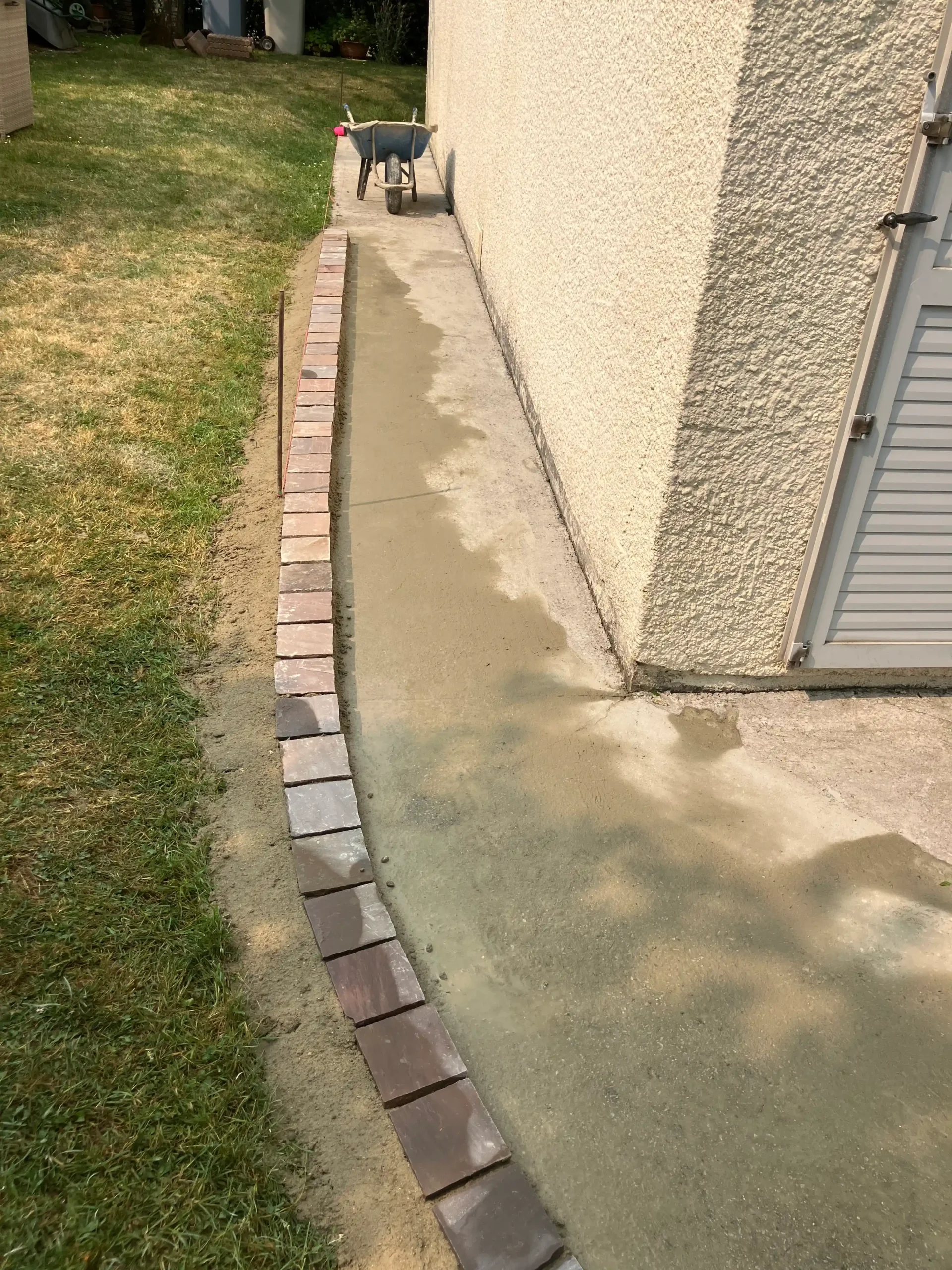 L’un des défis techniques majeurs de ce chantier résidait dans la réalisation des formes courbes. Pour éviter que la terrasse ne s’écarte avec le temps, nous avons scellé les bordures au mortier de ciment. Cette étape cruciale maintient la géométrie souhaitée et contient le lit de sable stabilisé.