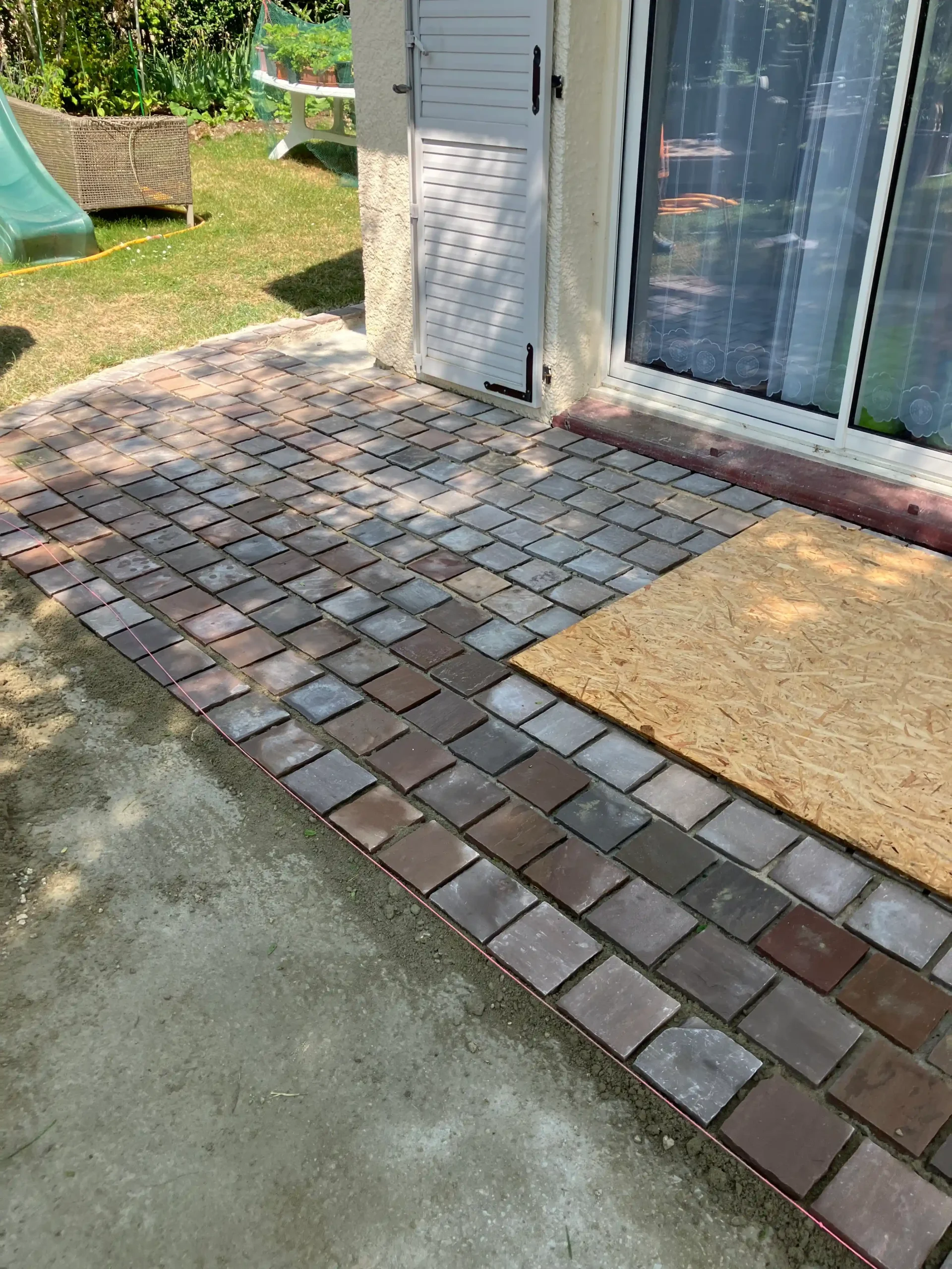 Création d’une terrasse pavée sur un lit de sable aux Essarts-le-Roi (78)