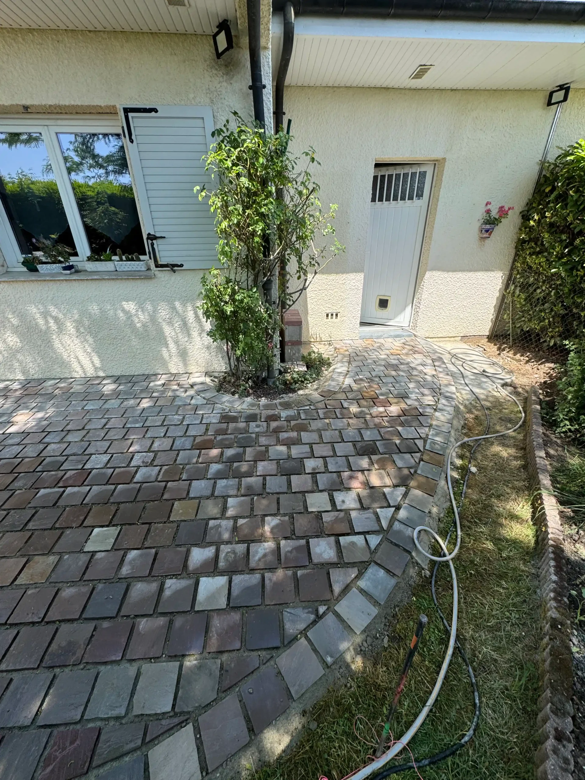 Le type de pose retenu ici permet également des interventions simples : si un pavé est endommagé, il suffit de le déposer et de le remplacer individuellement, sans casser l’ensemble de la surface comme ce serait le cas avec du béton coulé.