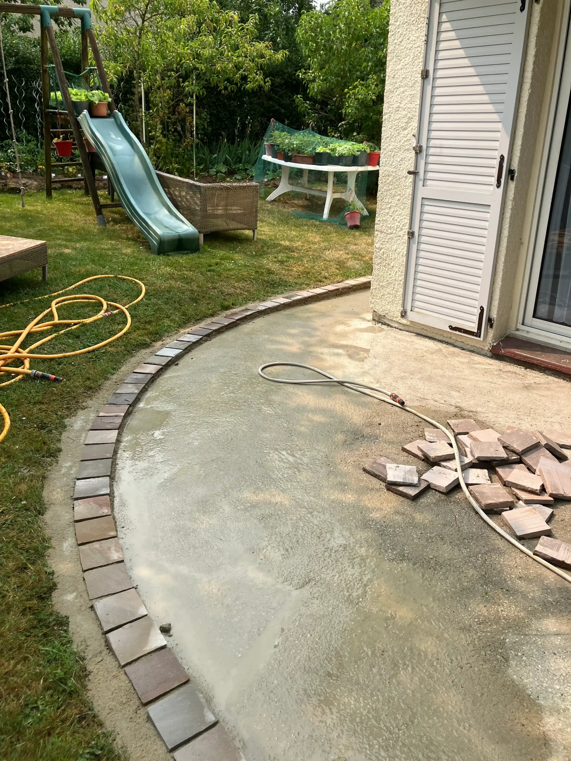 Projet d’aménagement extérieur de 40m² aux Essarts-le-Roi. Création d’une terrasse en pavés nuancés posés sur lit de sable avec bordures courbes scellées. Une technique traditionnelle garantissant drainage et stabilité.