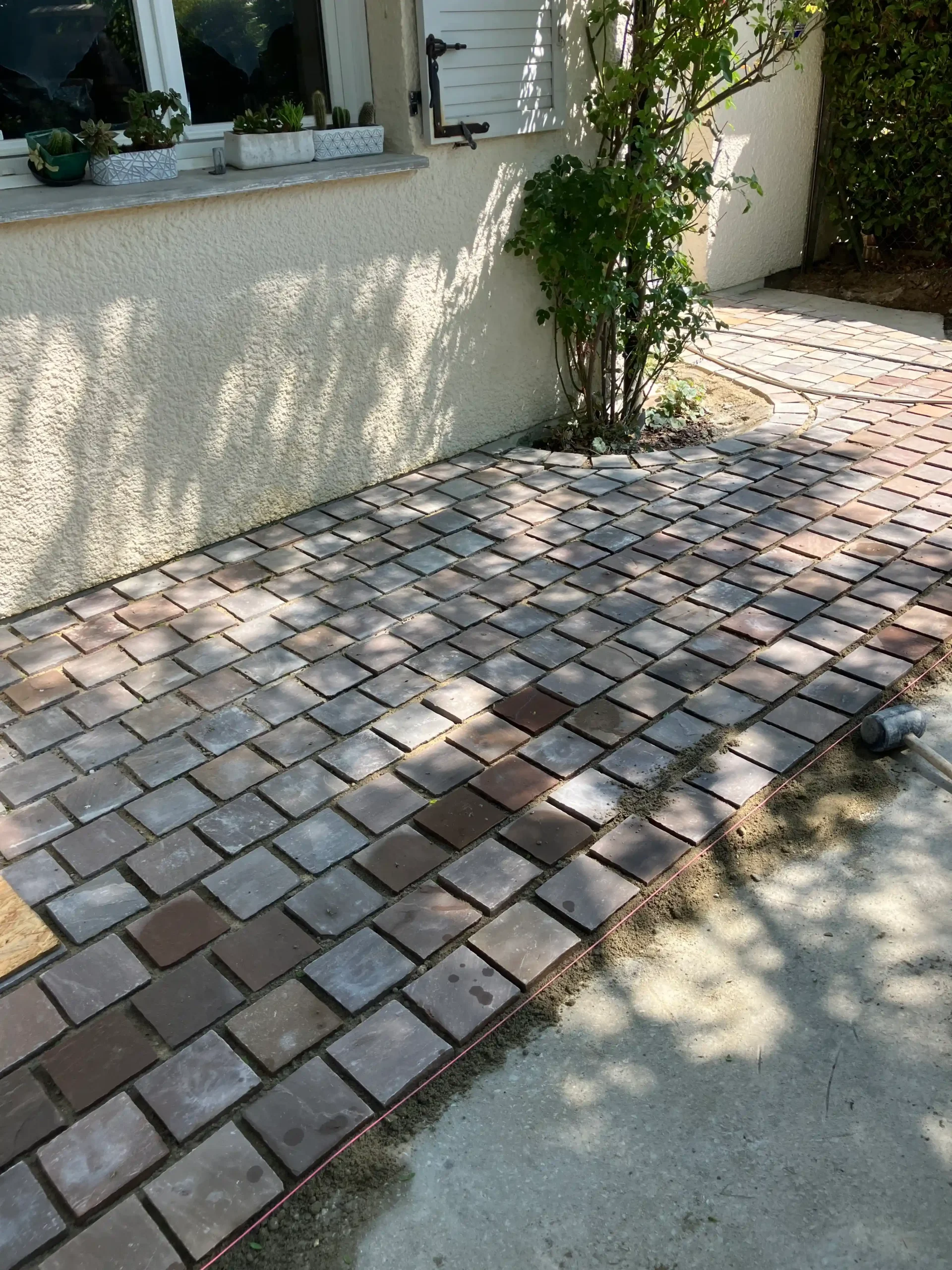 Pour ajuster certains pavés légèrement hauts, nous utilisons un maillet en caoutchouc qui permet de les enfoncer délicatement dans le sable sans les endommager. Cette technique garantit une surface plane et sécurisée.